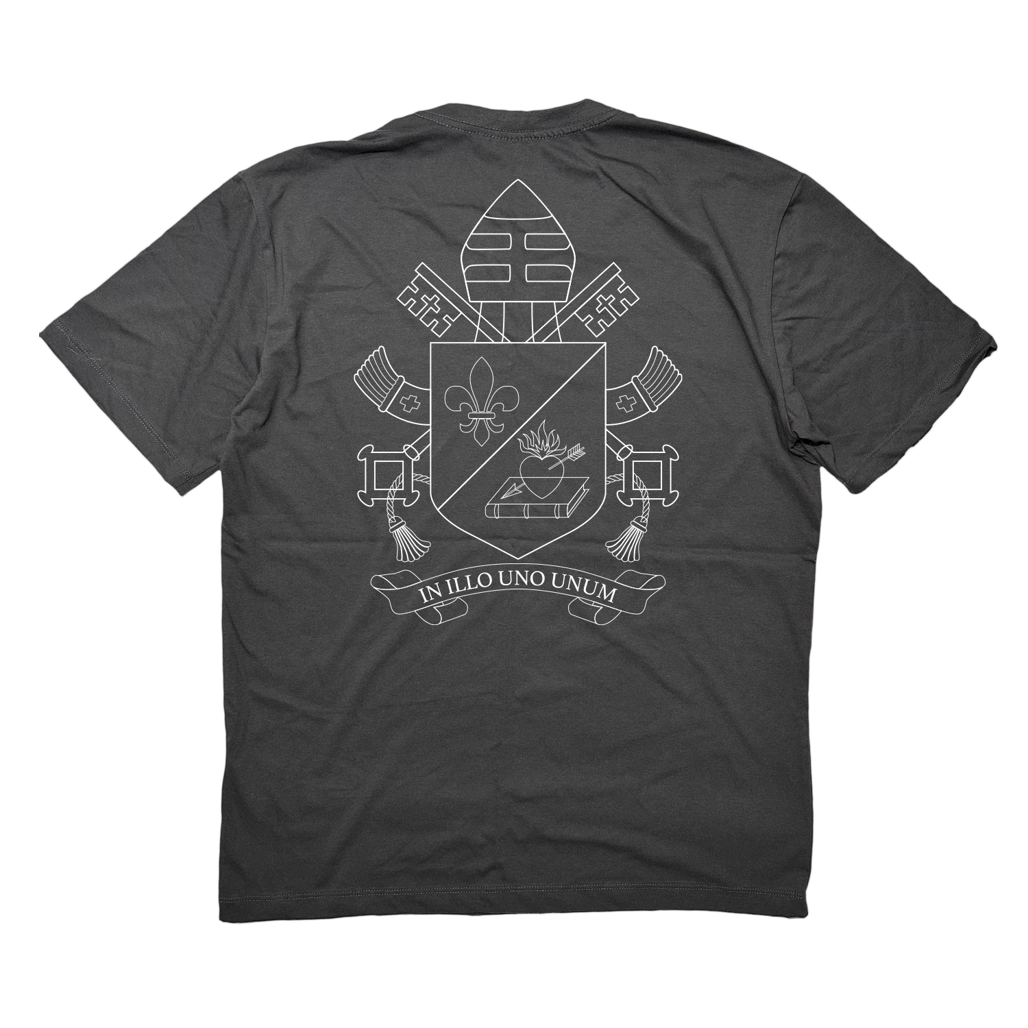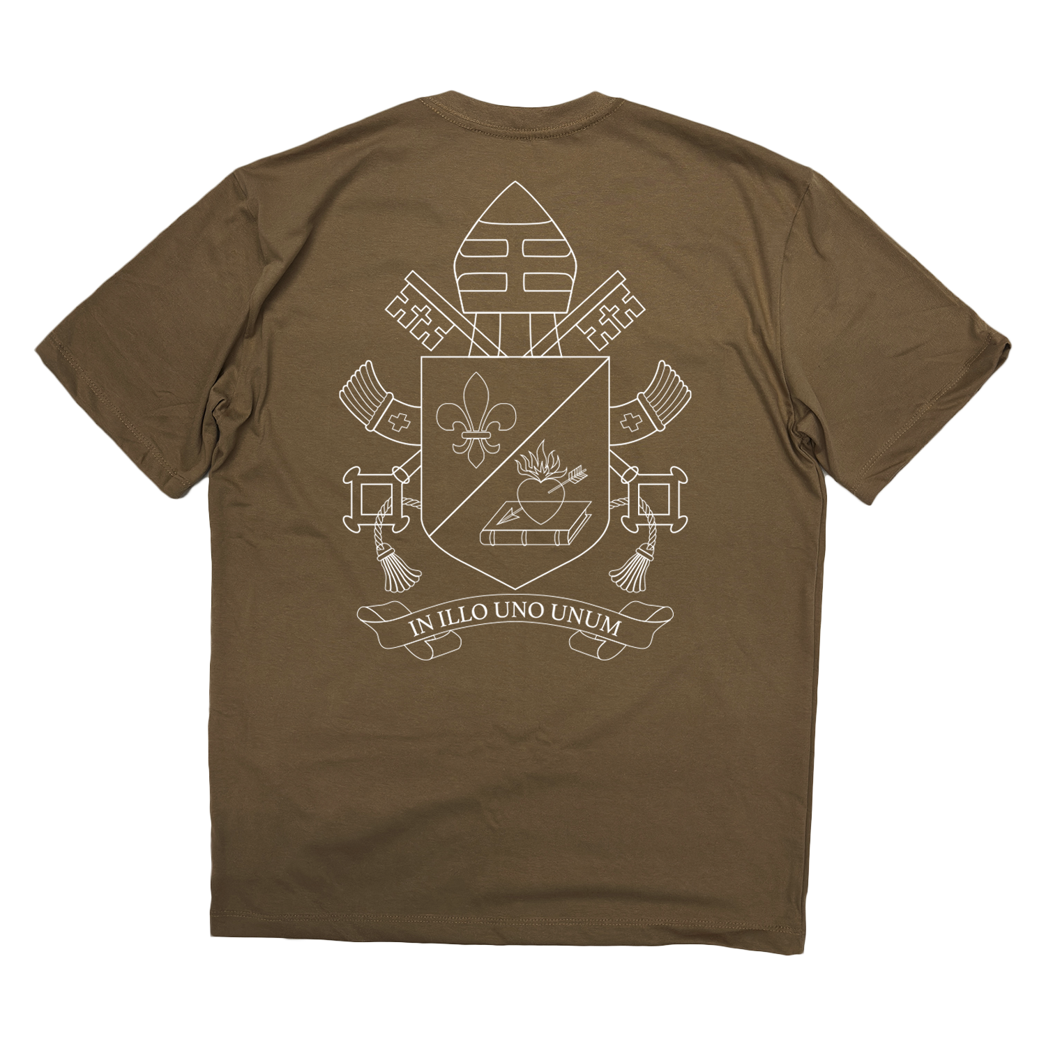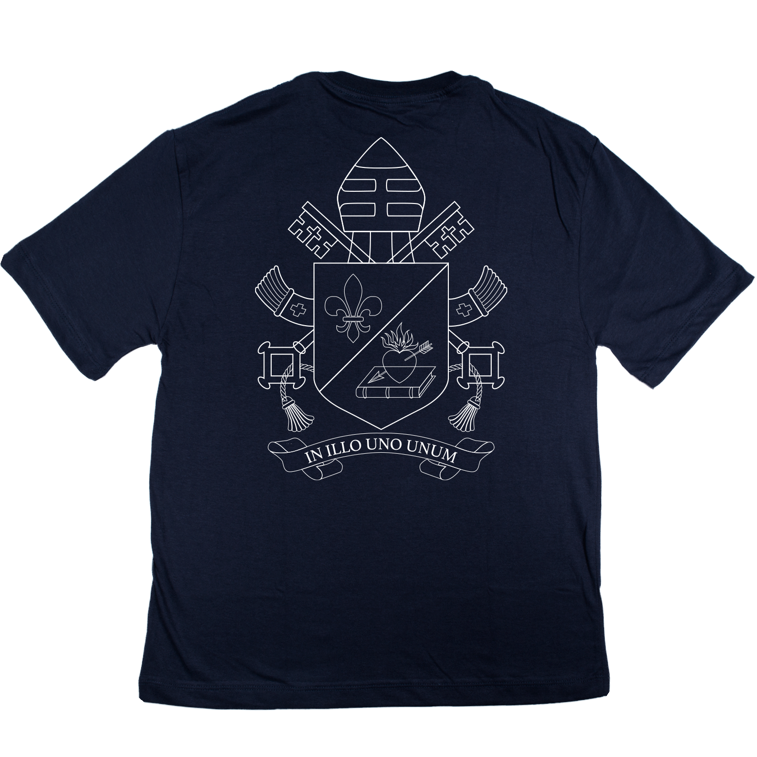 Nas costas, o design surpreende com uma arte minimalista e elegante: o brasão do Papa Leão XIV impresso em line art(arte linear), com traços finos e precisos que revelam a profundidade do símbolo sem sobrecarregar o visual. É uma representação sutil, mas cheia de significado — perfeita para quem carrega sua fé com estilo e propósito.