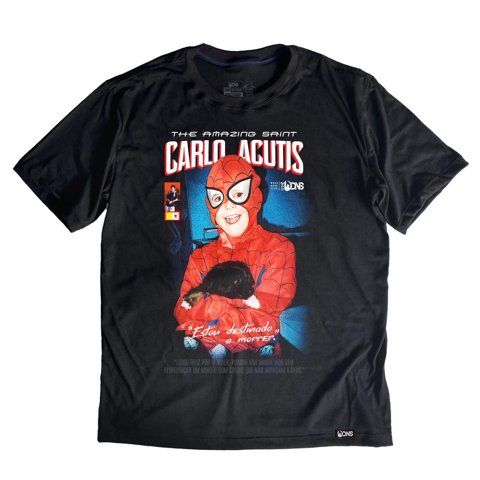 In black, this Catholic oversized shirt features a bold front print with two striking quotes from Carlo Acutis, along with his name highlighted in the design. Together, these elements remind us that it is possible to live the Catholic faith while being young — facing life’s challenges with courage, like true heroes.