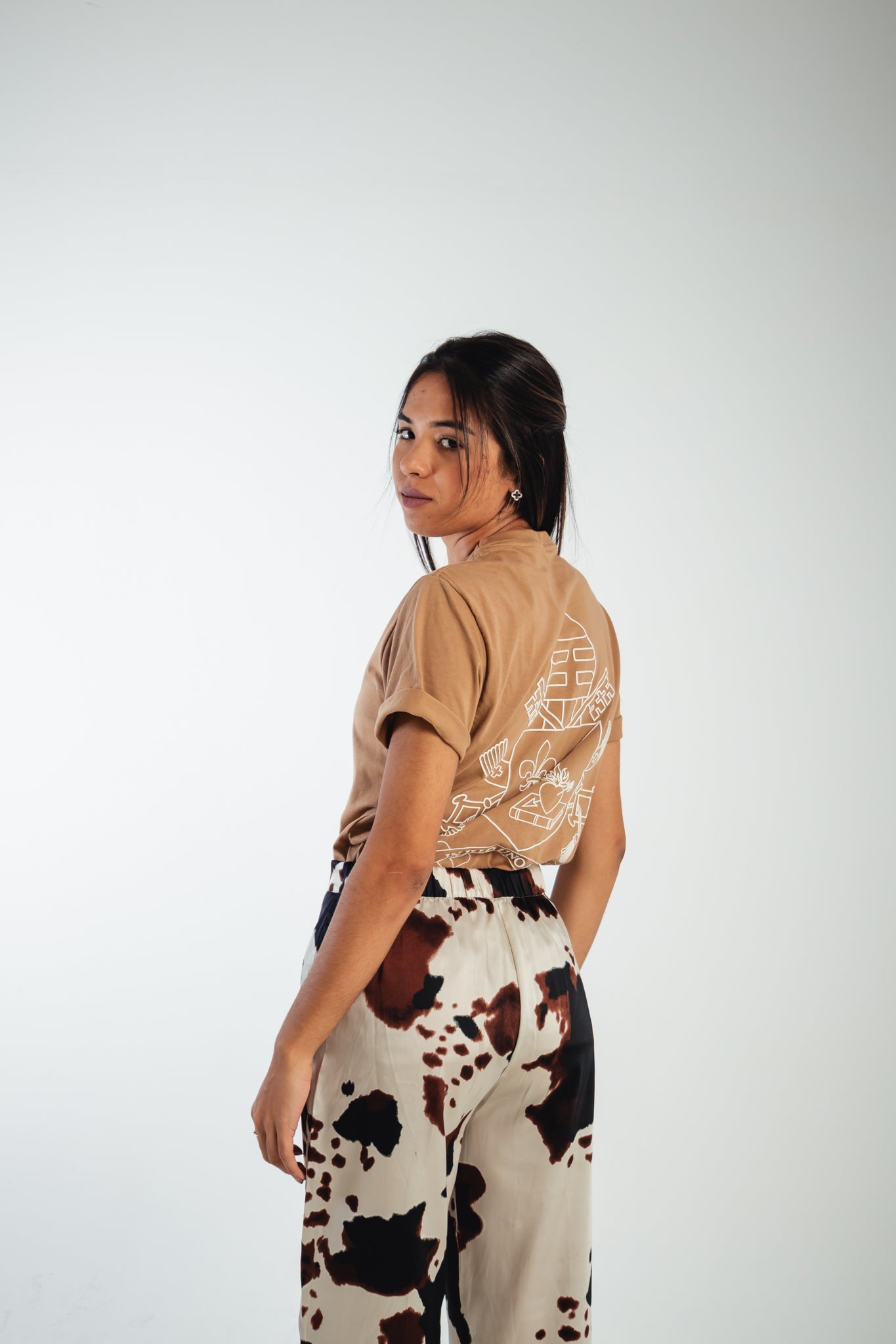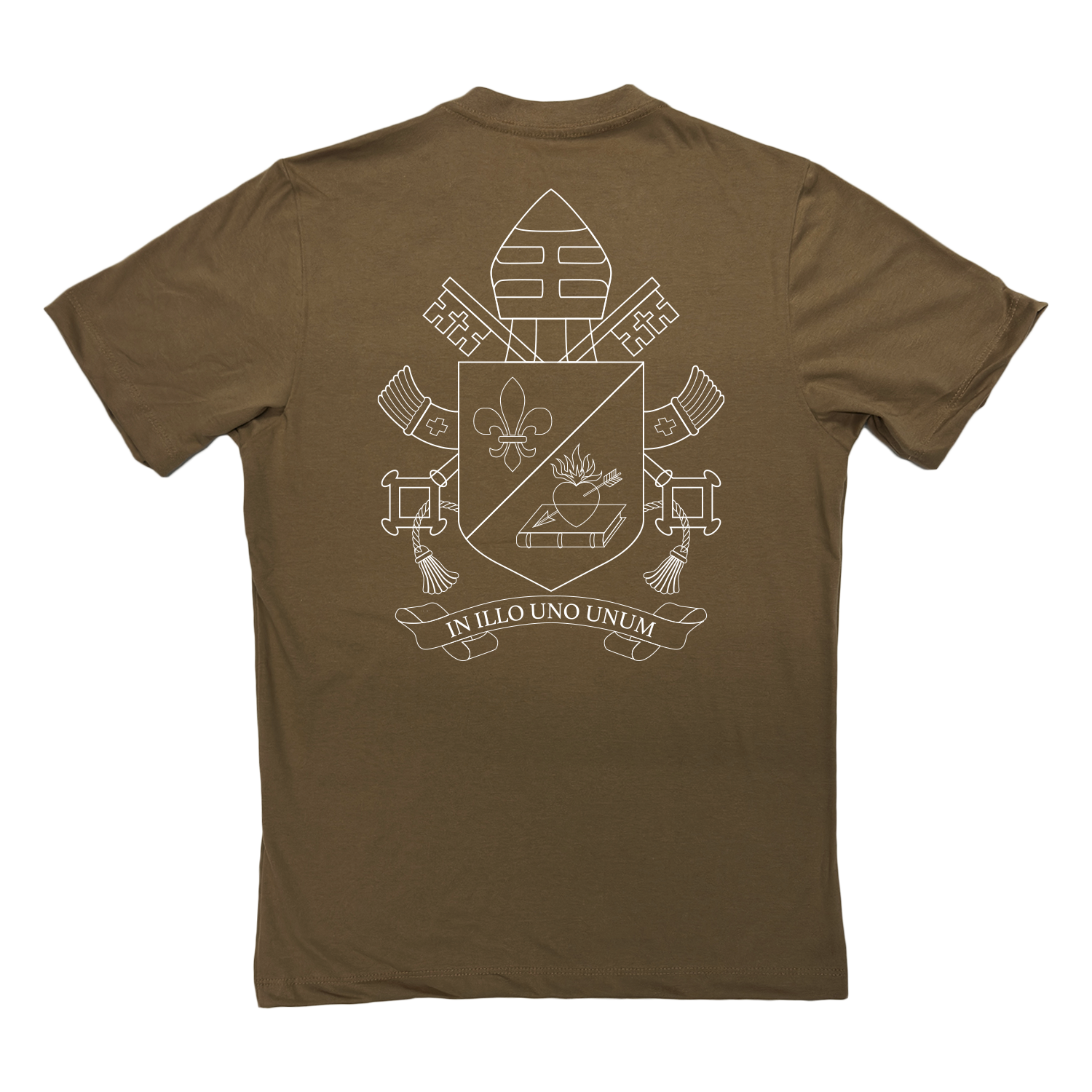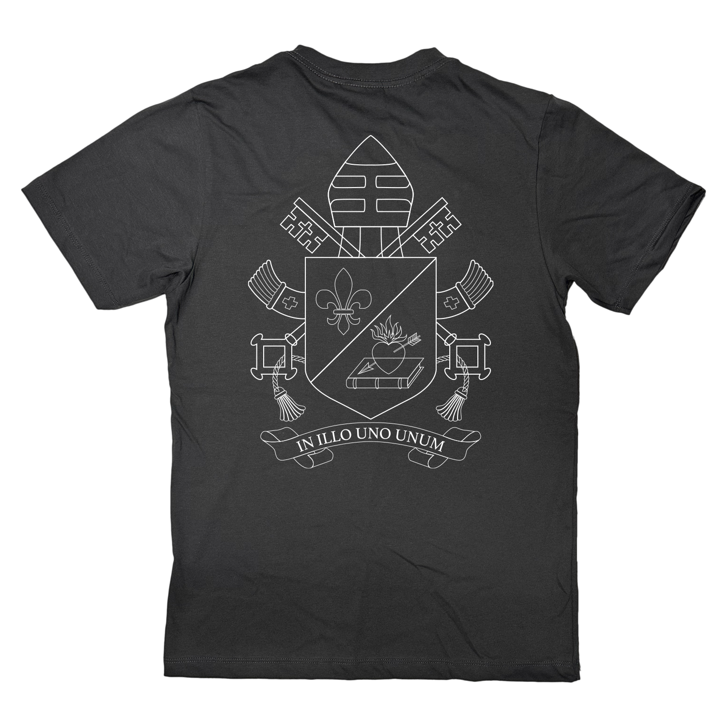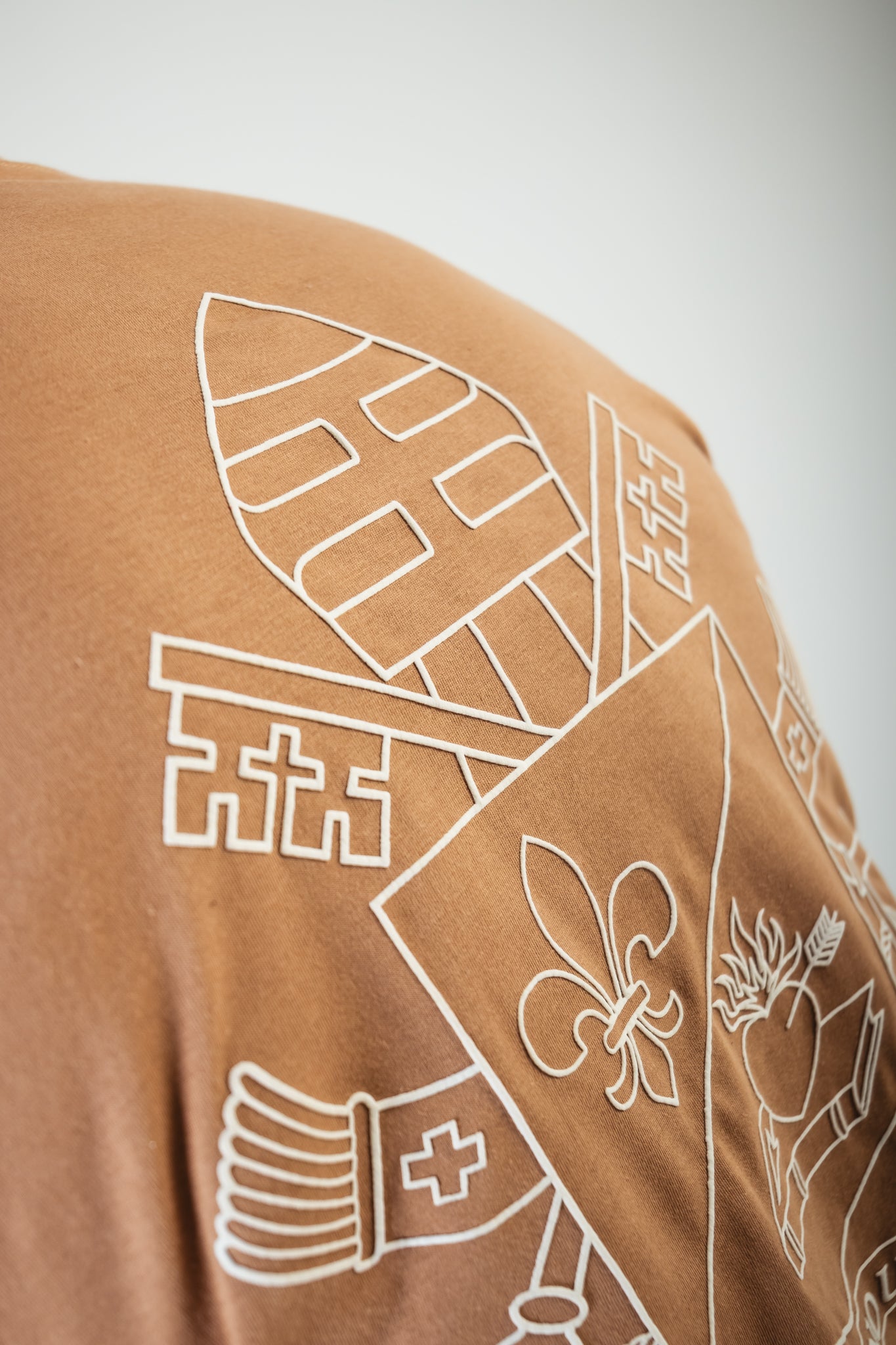 Nas costas, o design surpreende com uma arte minimalista e elegante: o brasão do Papa Leão XIV impresso em line art(arte linear), com traços finos e precisos que revelam a profundidade do símbolo sem sobrecarregar o visual. É uma representação sutil, mas cheia de significado — perfeita para quem carrega sua fé com estilo e propósito.